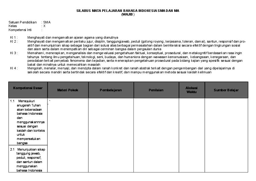 Silabus Bahasa Indonesia Sma Kelas X Semester 1 Dan 2 Kurikulum