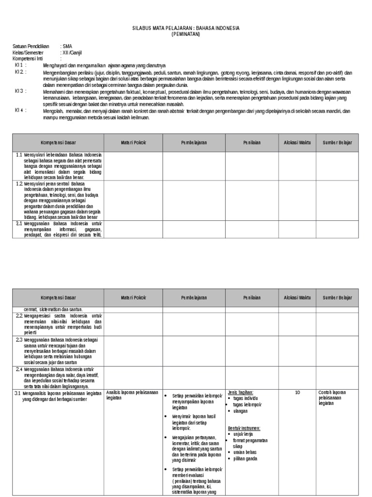 Silabus Bahasa Indonesia Kelas Xii Sma Peminatan Docx